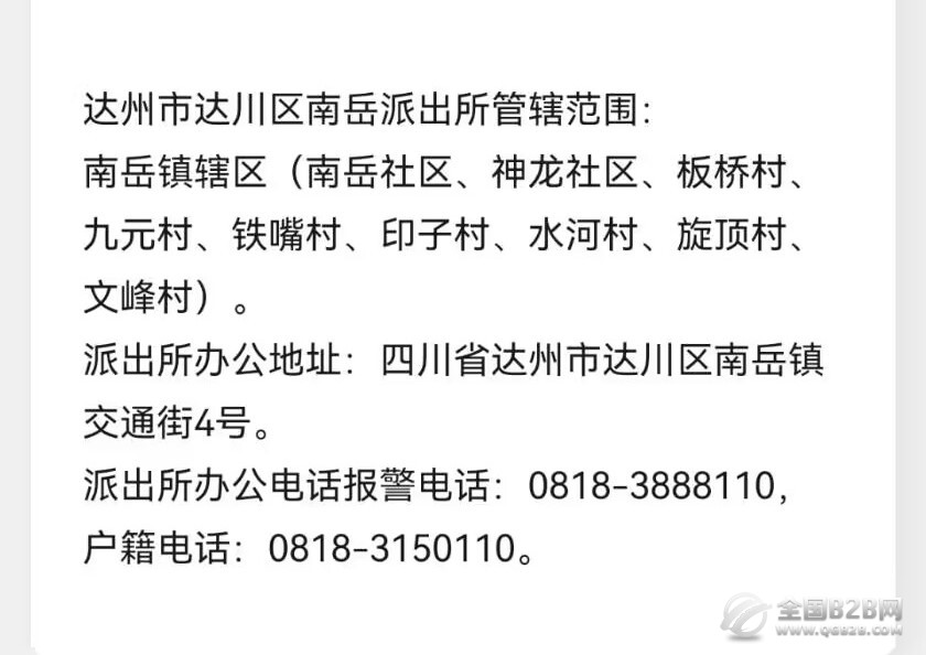 达州市达川区南岳派出所值班电话、户籍电话及管辖范围信息公开:
