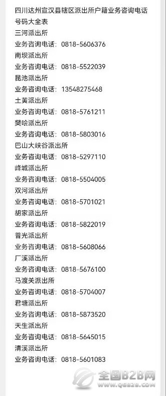 四川达州宣汉县辖区派出所办理户籍户政咨询电话号码大全表: