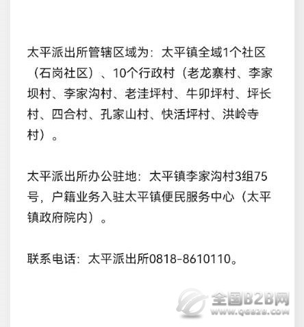备注:万源市太平派出所管辖区域及办公联系电话号码信息来源于万源市当地主管部门公开之内容,整理转载此文是出于传递更多便民服务信息之目的。若有来源标注错误或者其它差错或侵犯了您的合法权益,请与本网站联系,我们将及时更正、删除。以上内容如有变更,以相关部门的更新内容为主。谢谢。
