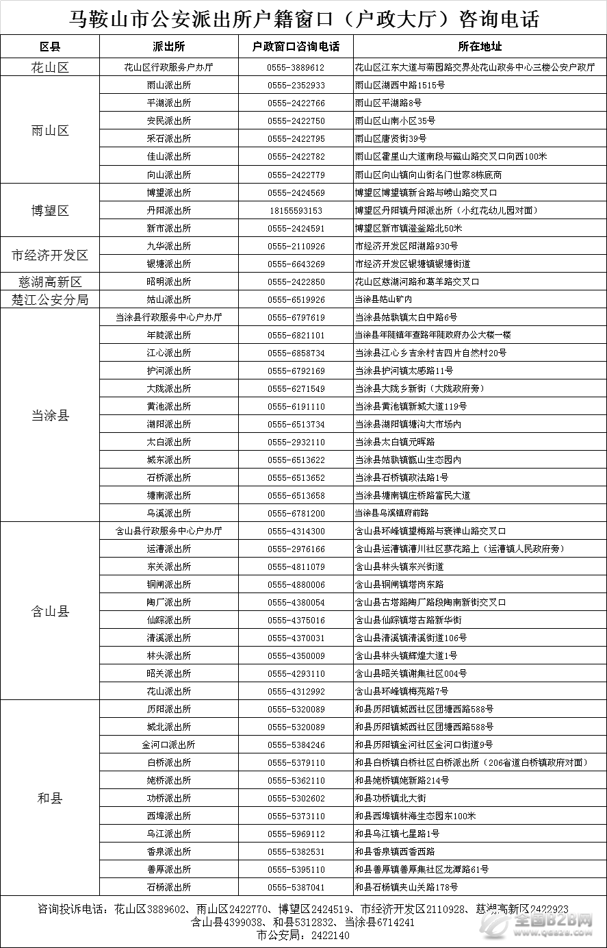 马鞍山市派出所户籍窗口(户政大厅)咨询电话及办公地址信息大全表:为进一步方便广大人民群众,马鞍山市对全市派出所户籍电话进行了全面梳理,现将新目录公布给大家,如户籍类问题可直接拨打电话。派出所将以热情地服务、快速地反应、高效地服务,全力提升人民群众安全感满意度。