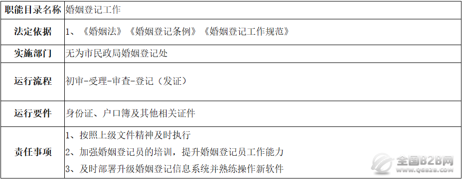 无为市婚姻登记处工作职责:办理婚姻登记,出具无婚姻登记记录证明,撤消受胁迫婚姻,提供便民、利民服务项目。