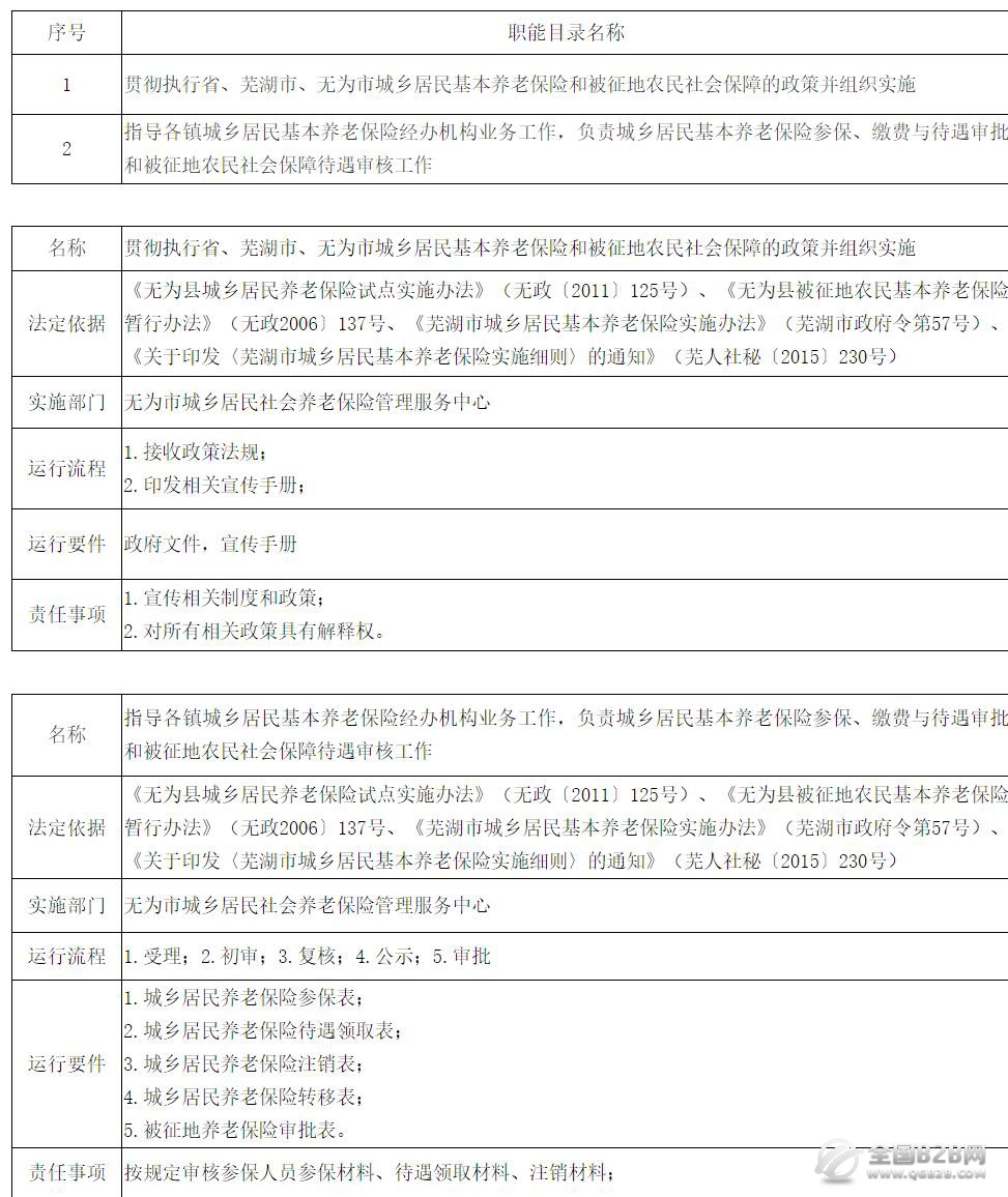 无为市城乡居民社会养老保险管理服务中心职责描述:贯彻执行省、芜湖市、无为市城乡居民基本养老保险和被征地农民社会保障的政策并组织实施;指导各镇城乡居民基本养老保险经办机构业务工作,负责城乡居民基本养老保险参保、缴费与待遇审批和被征地农民社会保障待遇审核工作。