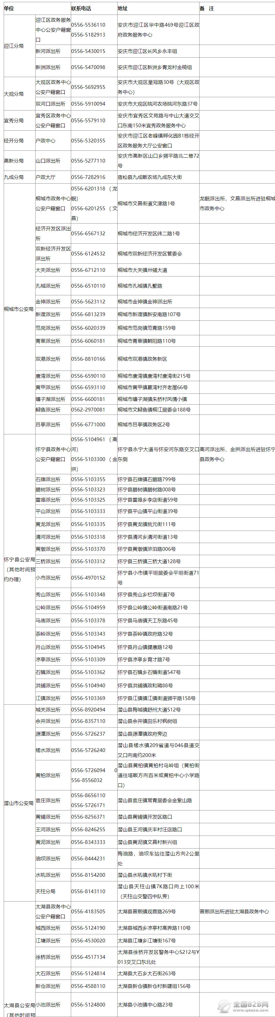 声明:安庆市全市户政窗口地址及联系电话大全表信息来源于安庆市当地主管部门公开之内容,整理转载此文是出于传递更多便民服务信息之目的。以上信息仅供参考,由于时间及其他方面的原因可能会发生变动,不准确之处请原谅!若有来源标注错误或者其它差错或侵犯了您的合法权益,请与本网站联系,我们将及时更正、删除。以上便民信息内容如有变更,以相关部门的更新内容为主。谢谢。