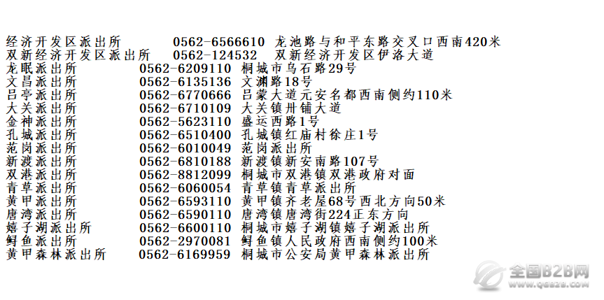 声明:桐城市辖区派出所联系电话和办公地址信息大全表信息来源于桐城市政府网站公开之内容,整理转载此文是出于传递更多便民服务信息之目的。以上信息仅供参考,由于时间及其他方面的原因可能会发生变动,不准确之处请原谅!若有来源标注错误或者其它差错或侵犯了您的合法权益,请与本网站联系,我们将及时更正、删除。以上便民信息内容如有变更,以相关部门的更新内容为主。谢谢。