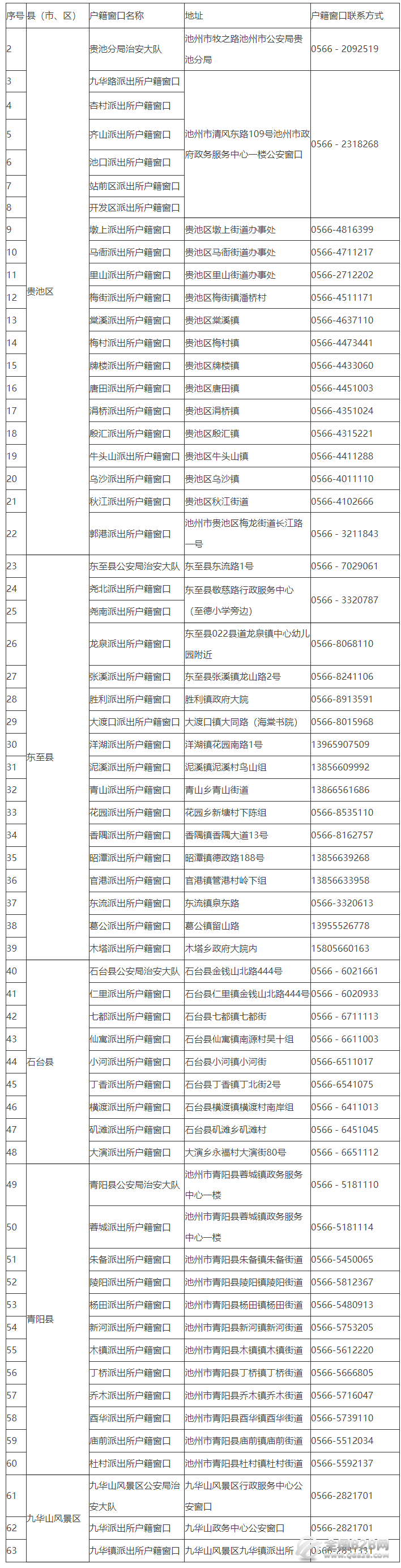 提示:池州市辖区派出所户口、身份证窗口联系方式(咨询电话办公地址)大全信息来源于当地主管部门公开之内容,整理转载此文是出于传递更多便民服务信息之目的。以上信息仅供参考,由于时间及其他方面的原因可能会发生变动,不准确之处请原谅!若有来源标注错误或者其它差错或侵犯了您的合法权益,请与本网站联系,我们将及时更正、删除。以上便民信息内容如有变更,以相关部门的更新内容为主。谢谢。