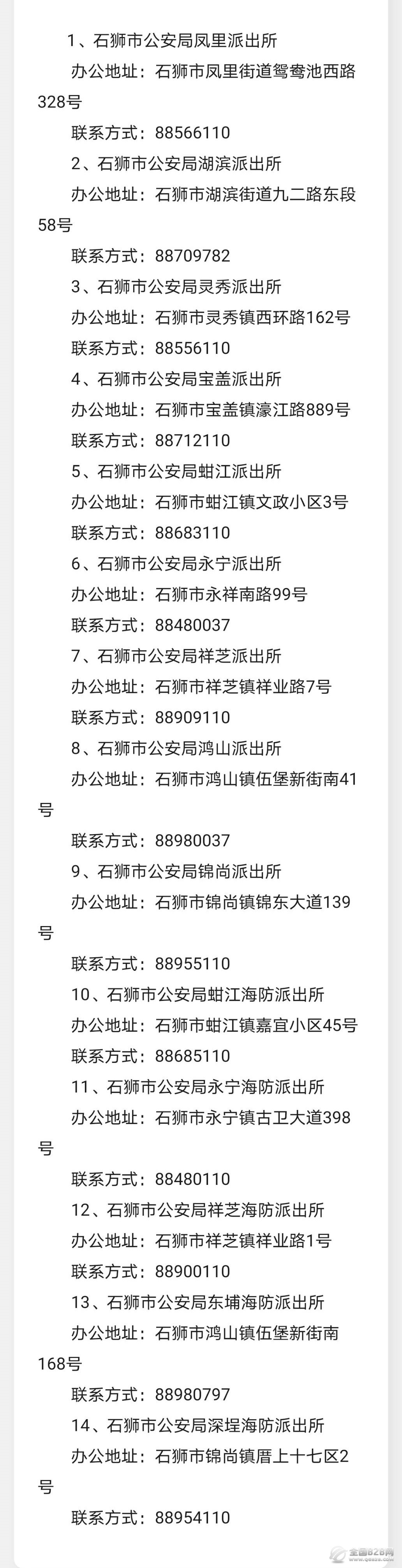 便民信息:福建石狮市各派出所联系方式和办公地址信息大全表。