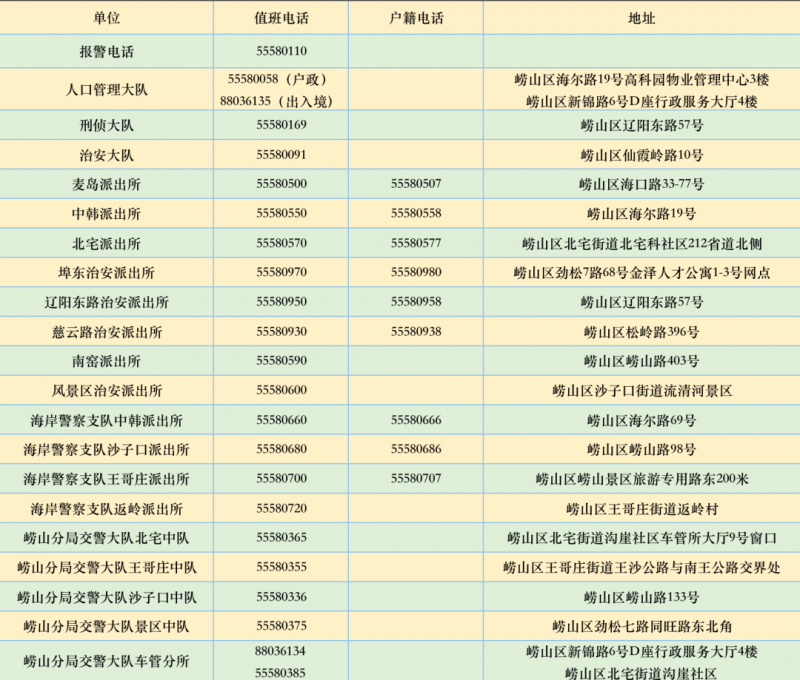 青岛市公安局崂山分局各业务大队、派出所值班电话户籍电话、交警大队电话汇总表:危急时刻怎么办?公安局来帮忙!在这里整理发布了青岛市公安局崂山分局各业务大队、派出所、交警中队的地址、联系电话等信息,太实用了!快收藏吧,没准哪天就能用上呢!青岛市公安局崂山分局各业务大队及派出所联系电话汇总如下: