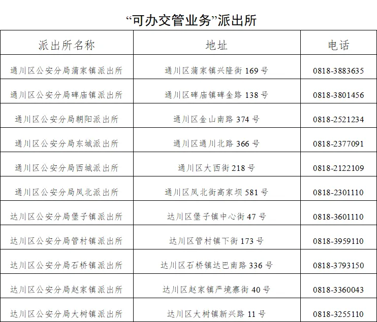 达州市(区市县)辖区这些派出所可以办理交管业务,请看派出所大全表。办理交管业务,交警大队在县城?车管所太远了?办业务排队太长?告诉大家一个好消息,现在,达州市辖区39个基层派出所可以办理交管业务啦!