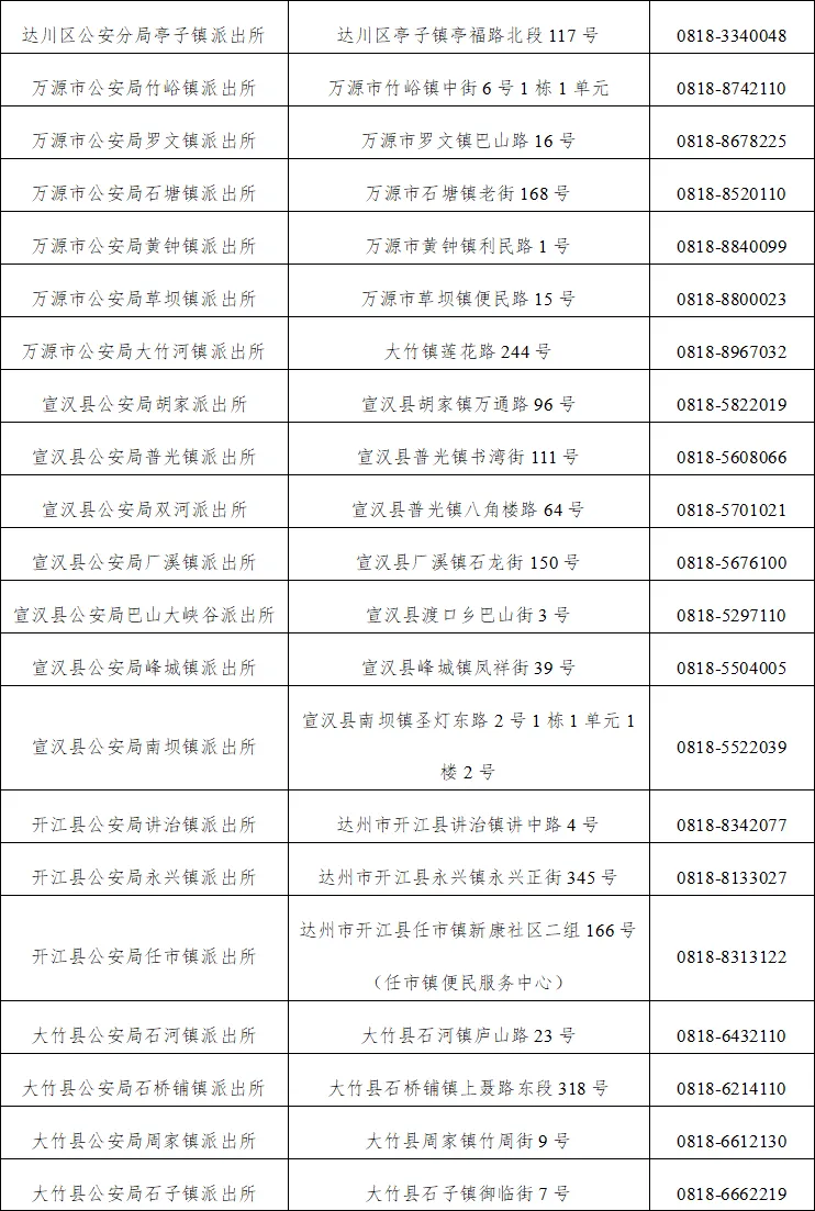 达州市全市39个“可办交管业务”派出所及咨询电话大全表,办事群众可自行选择,就近办理车驾管业务。