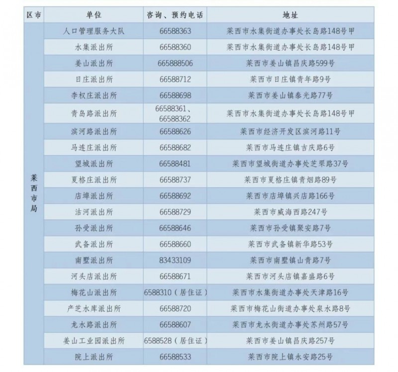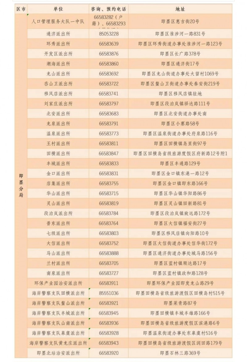 4,山东青岛市即墨区辖区派出所户籍户政业务窗口咨询预约电话号码汇总表: