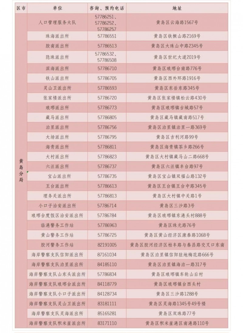 5,山东青岛市黄岛区辖区派出所户籍户政业务窗口咨询预约电话号码汇总表: