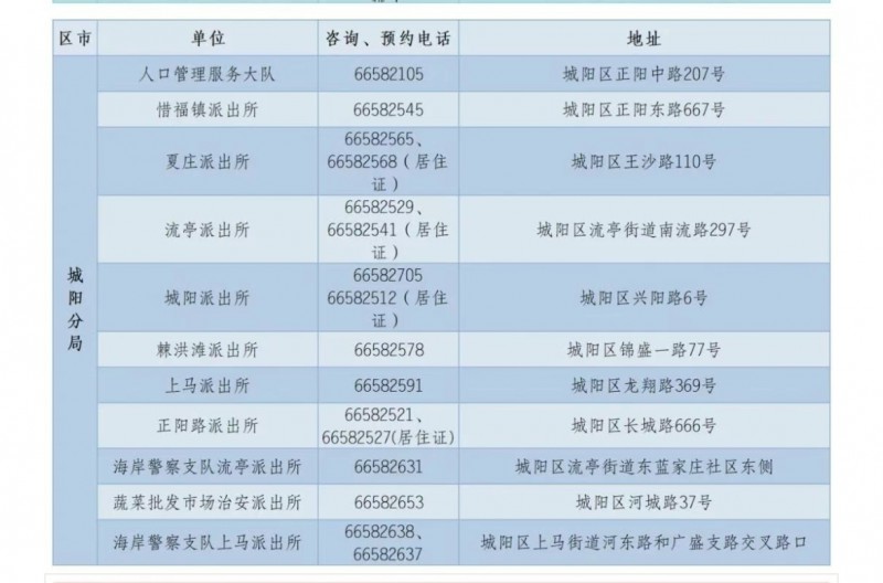 6,山东青岛市城阳区辖区派出所户籍户政业务窗口咨询预约电话号码汇总表:
