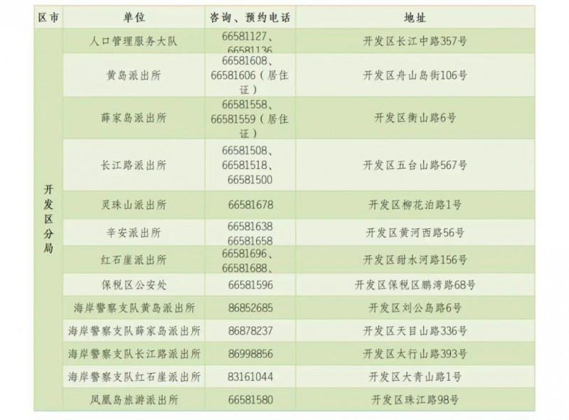 8,山东青岛市开发区辖区派出所户籍户政业务窗口咨询预约电话号码汇总表: