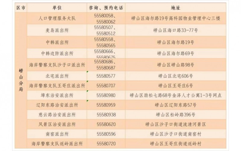 9,山东青岛市崂山区辖区派出所户籍户政业务窗口咨询预约电话号码汇总表: