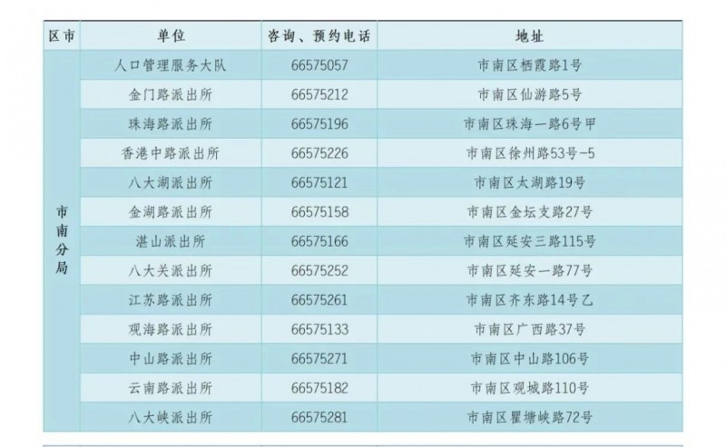 12,山东青岛市市南区辖区派出所户籍户政业务窗口咨询预约电话号码汇总表: