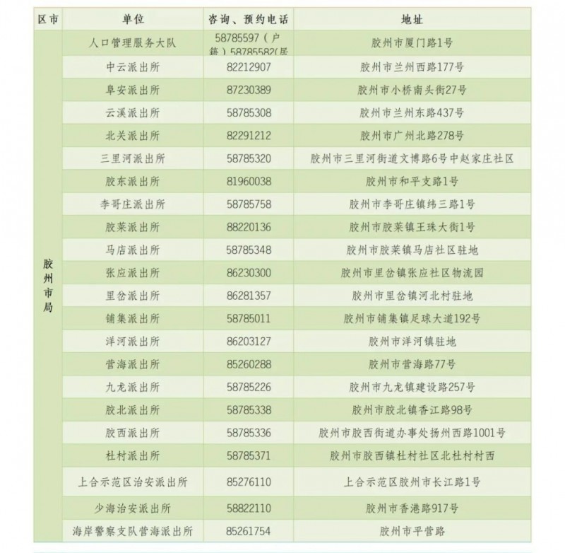 便民服务信息黄页:青岛胶州市辖区派出所户籍窗口咨询预约电话号码汇总表。为了更好的本地经济发展和人民生活,进一步转变作风,提高履职水平,提升人民群众满意度,现将青岛胶州市辖区派出所户籍窗口咨询电话及地址整理公开如下: