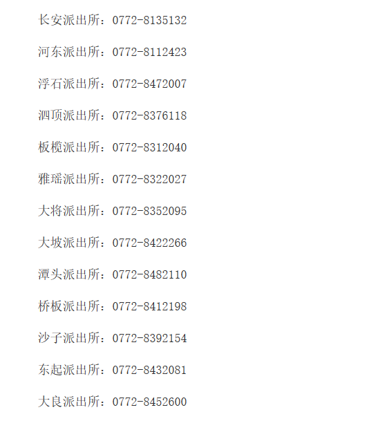 便民电话黄页:广西柳州融安县各派出所对外联系电话号码汇总表。长安派出所、河东派出所、浮石派出所、泗顶派出所、板榄派出所、雅瑶派出所、大将派出所、大坡派出所、潭头派出所、桥板派出所、沙子派出所、东起派出所、大良派出所。