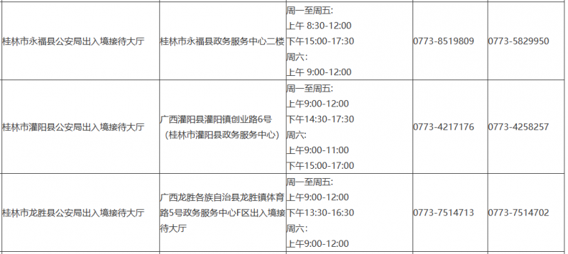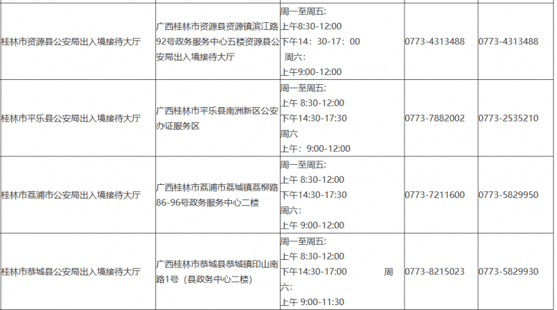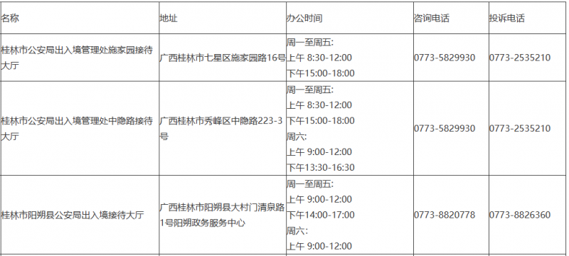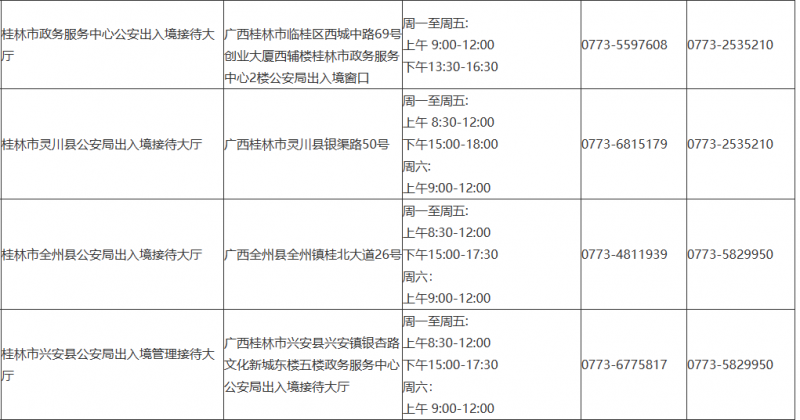 提示:关于桂林市辖区出入境管理部门受理窗口电话及地址汇总表的信息作出免责提示,本信息发布的目的仅为向公众提供更多的便民利民服务,是建立在公共服务信息基础上的公益信息传播,其信息来源于桂林市主管机构网站的公开内容。信息不排除因随着时间或者相关情况发生原因而发生变化变更,所以本信息仅作参考。本信息旨在通过网络提供更多相关便民利民服务信息,本信息的真实性以相关部门正式披露信息为准。如有错误之处或者如有侵权,请及时联系本网站客服,定会及时修改或者删除。