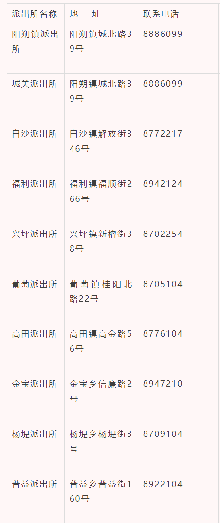 阳朔县各派出所户籍窗口地址及联系电话汇总表:为方便群众办理户籍业务,阳朔县各派出所户籍窗口将采取更积极的服务,全县派出所户籍窗口提供预约服务,现将户籍窗口名称、地址、联系电话公告如下。