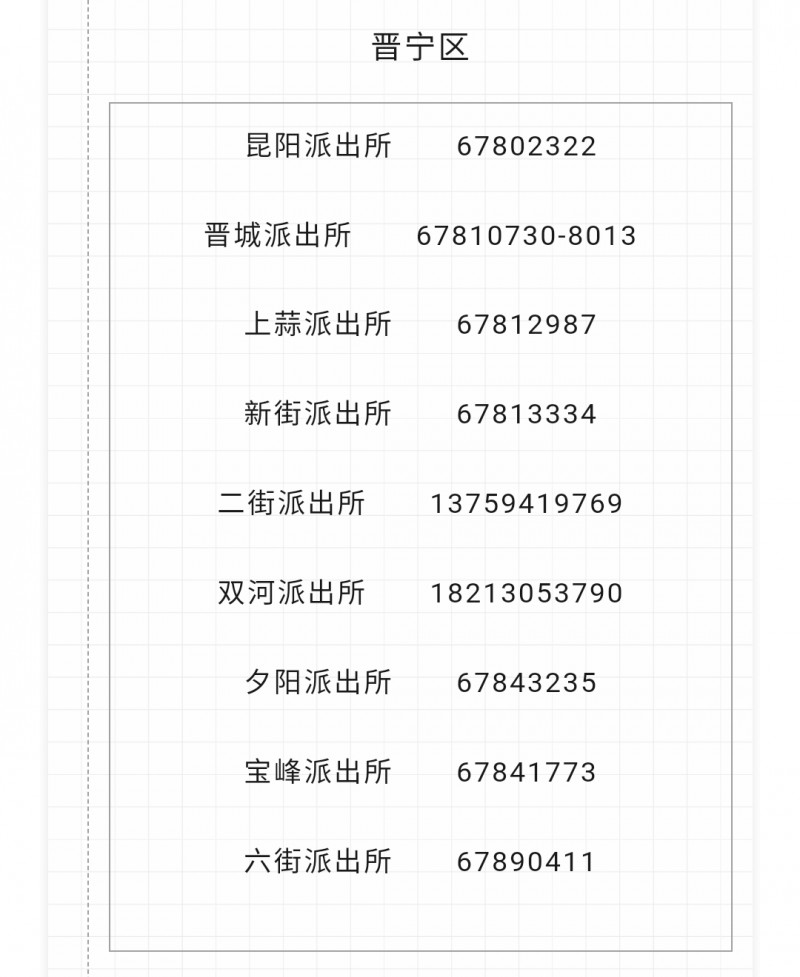 13昆明市晋宁区辖区各派出所户政窗口咨询电话号码汇总表: