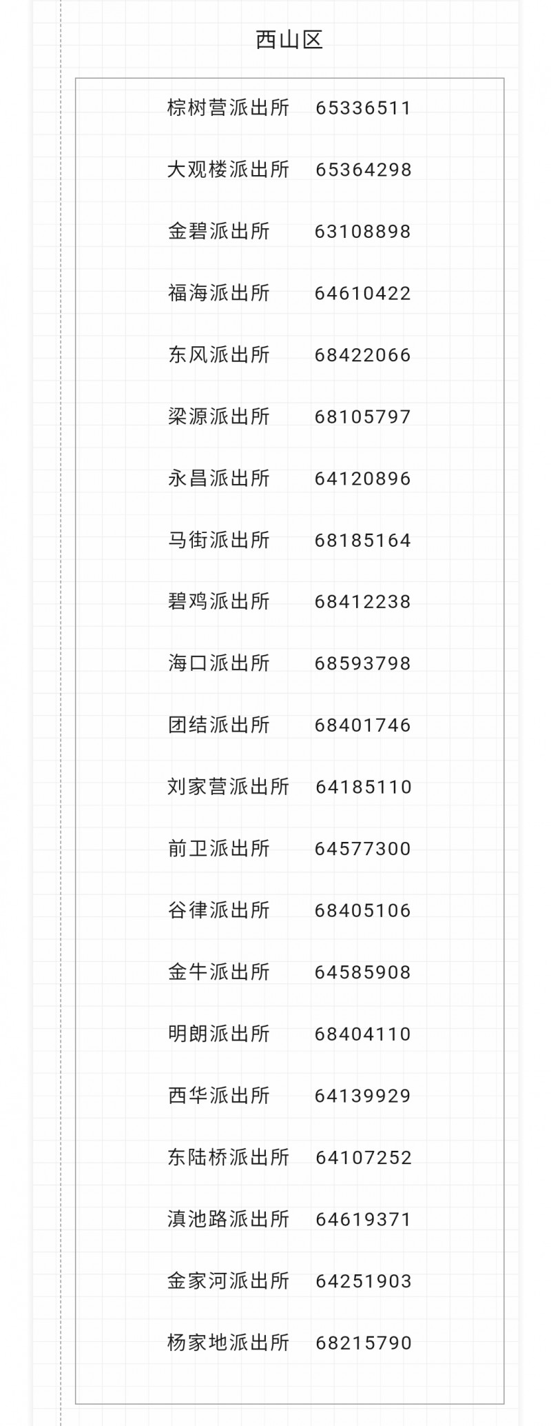 14昆明市西山区辖区各派出所户政窗口咨询电话号码汇总表: