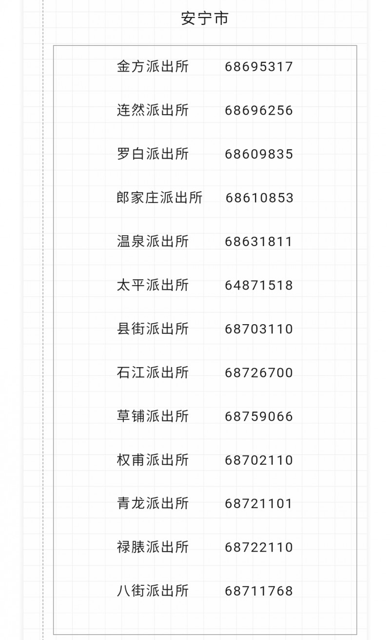 声明:关于昆明安宁市辖区各派出所户政窗口业务服务咨询固定电话号码汇总表的信息作出免责声明,信息来源于安宁市当地主管部门公开之内容,整理转载此文是出于传递更多便民服务信息之目的。以上信息仅供参考,由于时间及其他方面的原因可能会发生变动,不准确之处请原谅!若有来源标注错误或者其它差错或侵犯了您的合法权益,请与本网站联系,我们将及时更正、删除。以上便民信息内容如有变更,以相关部门的更新内容为主。谢谢。