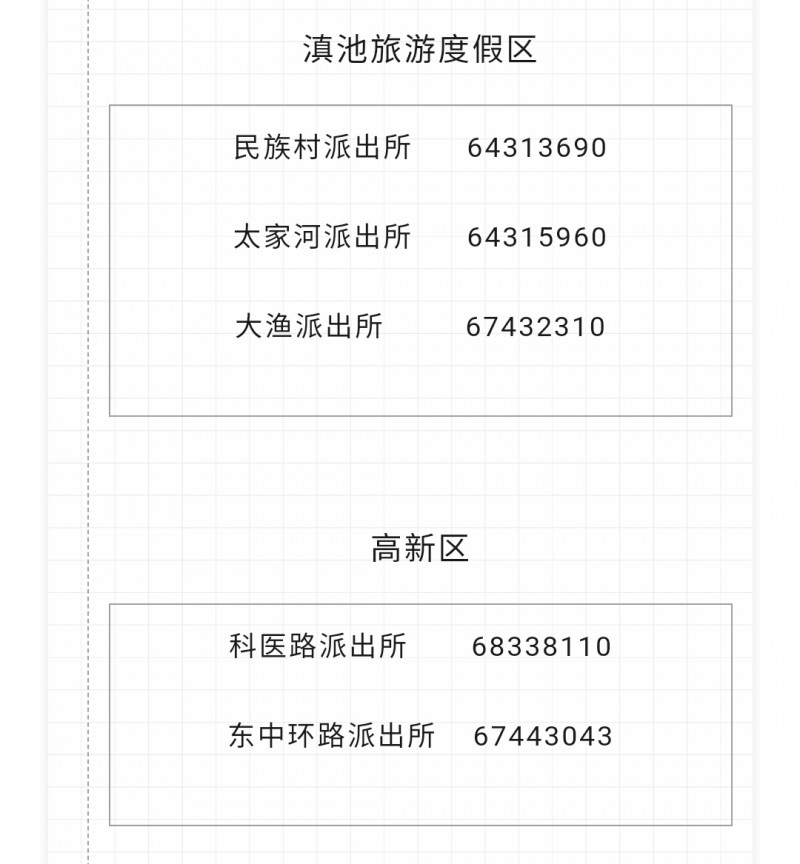 声明:关于昆明市滇池旅游度假区、高新区、经开区各派出所户政窗口咨询电话汇总表的信息作出免责声明,信息来源于当地主管部门公开之内容,整理转载此文是出于传递更多便民服务信息之目的。以上信息仅供参考,由于时间及其他方面的原因可能会发生变动,不准确之处请原谅!若有来源标注错误或者其它差错或侵犯了您的合法权益,请与本网站联系,我们将及时更正、删除。以上便民信息内容如有变更,以相关部门的更新内容为主。谢谢。