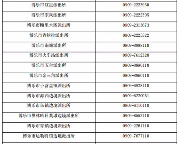 便民电话黄页:博乐市辖区派出所值班电话号码大全表。