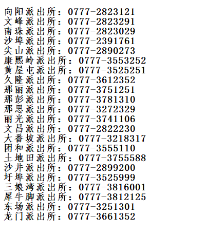 说明:关于钦州市钦南区各派出所值班电话号码大全表的信息作出免责说明,1,信息的源处为当地政府主管部门公开之内容,在这里整理及转发的唯一目的是为社会提供更多的便民利民网络信息。互联网的存在,让我们多了一个方便快捷的信息渠道,也是公共服务信息发布的渠道。