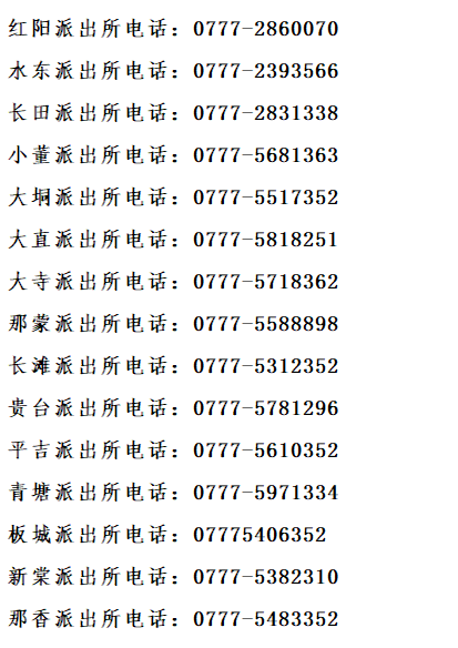 声明:关于钦州市钦北区各派出所值班电话号码汇总表的信息作出免责声明,1,信息的源处为当地政府主管部门公开之内容,在这里整理及转发的唯一目的是为社会提供更多的便民利民网络信息。互联网的存在,让我们多了一个方便快捷的信息渠道,也是公共服务信息发布的渠道。