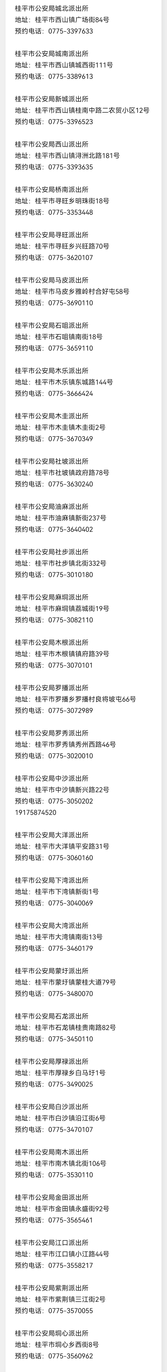 贵港桂平市辖区派出所户籍窗口咨询电话号码汇总表: