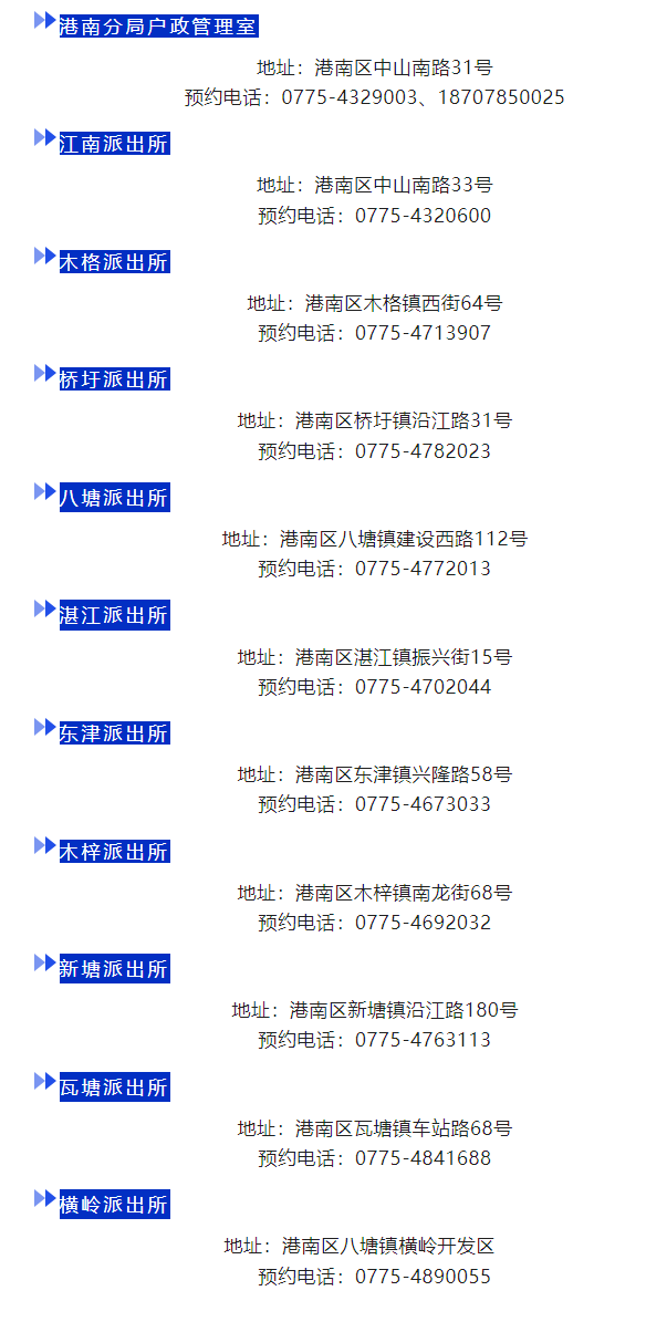 提示:关于贵港市港南区辖区派出所户籍业务咨询预约电话汇总表的信息作出免责提示,1,信息的源处为当地政府主管部门公开之内容,在这里整理及转发的唯一目的是为社会提供更多的便民利民网络信息。互联网的存在,让我们多了一个方便快捷的信息渠道,也是公共服务信息发布的渠道。