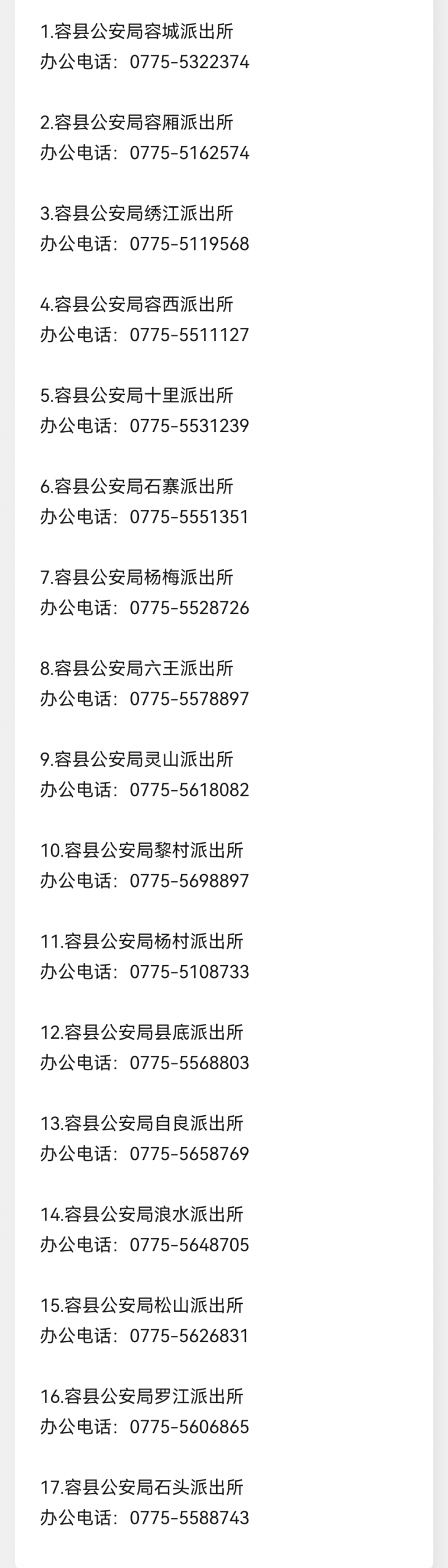 玉林市容县各派出所办公电话号码汇总表:玉林市容县辖区设有17个基层派出所。