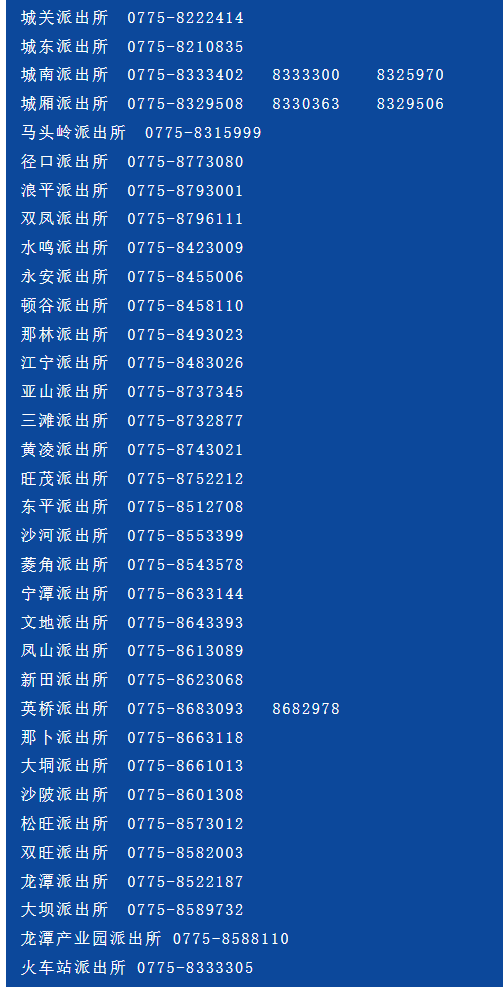 广西博白县辖区派出所联系电话号码汇总表:城关派出所 、城东派出所 、城南派出所 、城厢派出所 、马头岭派出所 、径口派出所、 浪平派出所 、双凤派出所 、水鸣派出所、 永安派出所 、顿谷派出所/ 那林派出所 、江宁派出所 、亚山派出所 、三滩派出所、 黄凌派出所 、旺茂派出所 、东平派出所、 沙河派出所 、菱角派出所 、宁潭派出所 、文地派出所 、凤山派出所、 新田派出所 、英桥派出所 、那卜派出所 、大垌派出所 、沙陂派出所 、松旺派出所 、双旺派出所、 龙潭派出所 、大坝派出所 、龙潭产业园派出所 、火车站派出所。