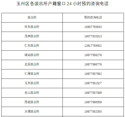 玉林市玉州区各派出所户籍窗口咨询预约电话号码汇总表: