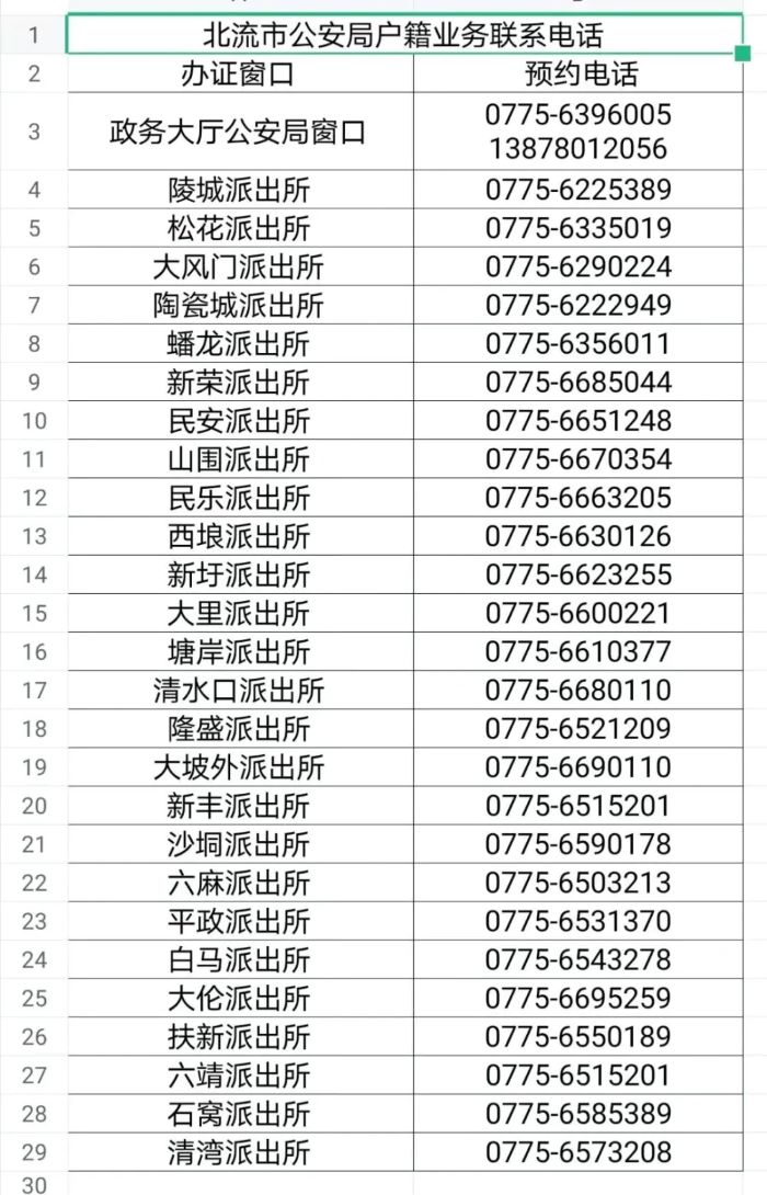 广西北流市辖区派出所户籍业务咨询联系电话号码汇总表:为全面贯彻落实便民利民服务措施,创人民满意派出所,北流市各派出所户籍窗口将对群众办理户籍业务提供周全的服务。当地群众可到全市任意一个就近户籍窗口办理身份证。户籍窗口采取延时服务、预约服务、送证上门等灵活多样的服务方式,当天受理、当天审核,进一步压缩办证周期。