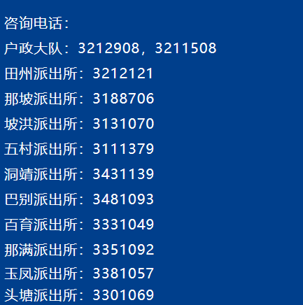 说明:关于百色市田阳区各派出所户籍业务咨询电话号码汇总表的信息作出免责说明,信息来源于当地主管部门公开之内容,整理转载此文是出于传递更多便民服务信息之目的。以上信息仅供参考,由于时间及其他方面的原因可能会发生变动,不准确之处请原谅!若有来源标注错误或者其它差错或侵犯了您的合法权益,请与本网站联系,我们将及时更正、删除。以上便民信息内容如有变更,以相关部门的更新内容为主。谢谢。