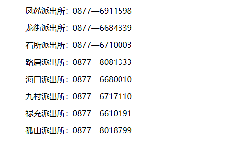 澄江市辖区派出所联系电话号码汇总表:凤麓派出所、龙街派出所、右所派出所、路居派出所、海口派出所、九村派出所、禄充派出所、孤山派出所