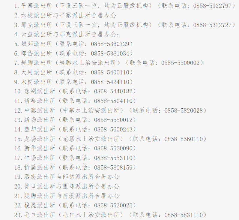 说明:关于六盘水市六枝特区各派出所联系电话号码大全表的信息作出免责说明,本信息来源于六盘水市六枝特区政府网站之公开内容,转载转发的目的在于传递更多便民利民之信息,并不代表本信息赞同其观点和对其真实性负责,也不构成任何其他建议。