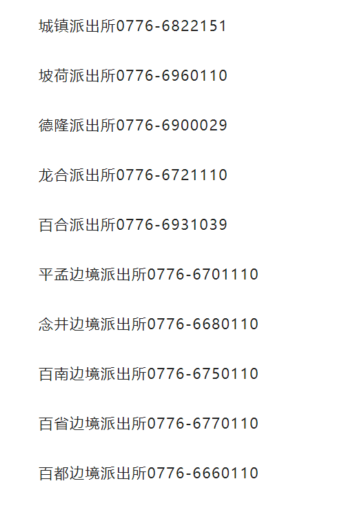 白色市那坡县辖区派出所值班电话号码汇总表:城镇派出所、坡荷派出所、德隆派出所、龙合派出所、百合派出所、平孟边境派出所、念井边境派出所、百南边境派出所、百省边境派出所、百都边境派出所