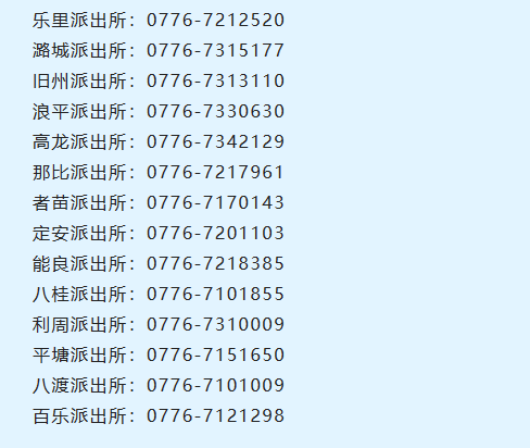 田林县各派出所户籍联系电话汇总表:乐里派出所、潞城派出所、旧州派出所、浪平派出所、高龙派出所、那比派出所、者苗派出所、定安派出所、能良派出所、八桂派出所、利周派出所、平塘派出所、八渡派出所、百乐派出所
