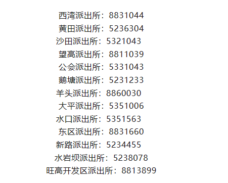 贺州市平桂区分局各派出所办公电话号码汇总表:西湾派出所、黄田派出所、沙田派出所、望高派出所、公会派出所、鹅塘派出所、羊头派出所、大平派出所、水口派出所、东区派出所、新路派出所、水岩坝派出所、旺高开发区派出所