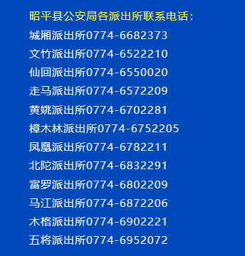 广西贺州昭平县辖区派出所办公电话号码大全表:城厢派出所 、文竹派出所、仙回派出所 、走马派出所、黄姚派出所 、樟木林派出所、凤凰派出所、 北陀派出所、富罗派出所、马江派出所、木格派出所 、五将派出所