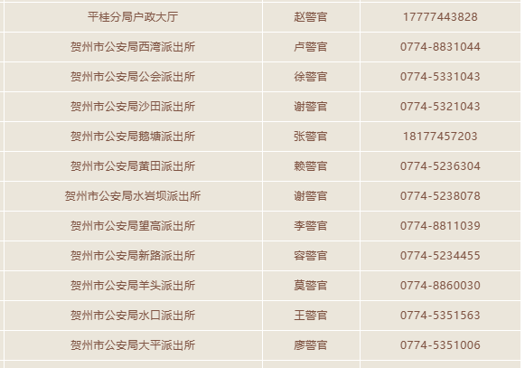 贺州市平桂区各派出所户籍业务咨询预约电话是多少:为方便广大人民群众办理户籍户政业务,贺州市平桂区辖区派出所将采取更加便捷的工作模式,满足群众办户办证需要。现将贺州市平桂区各派所户籍业务咨询预约电话公布如下,需要办理业务的群众可咨询预约办理。