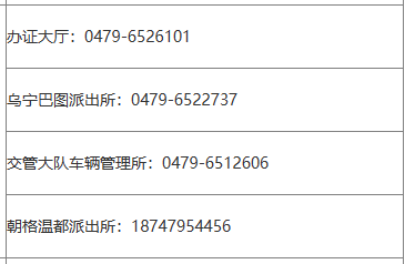 锡林郭勒盟正镶白旗户政大厅、派出所、车管所对外公开电话是多少: