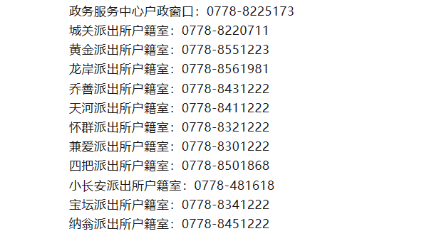 提示:关于罗城仫佬族自治县辖区派出所户籍室咨询联系电话号码汇总表的信息作出免责提示,免责声明:本信息发布的目的仅为向公众提供更多的便民利民服务,是建立在公共服务信息基础上的公益信息传播,其信息来源于罗城县主管机构的公开内容。信息不排除因随着时间或者相关情况发生原因而发生变化变更,所以本信息仅作参考。