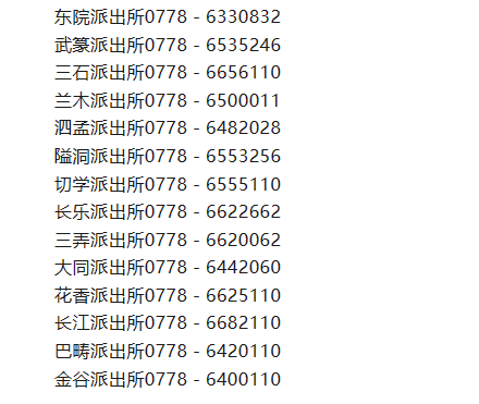 东兰县辖区派出所户籍窗口联系电话号码汇总表:东院派出所、武篆派出所、三石派出所、兰木派出所、泗孟派出所、隘洞派出所、切学派出所、长乐派出所、三弄派出所、大同派出所、花香派出所、长江派出所、巴畴派出所、金谷派出所、