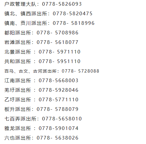 大化瑶族自治县局户政管理大队及各派出所户籍联系电话汇总表:户政管理大队、镇北、镇西派出所、镇南、贡川派出所、都阳派出所、 岩滩派出所、北景派出所 、共和派出所、 百马、古文、古河派出所、江南派出所 、羌圩派出所、 乙圩派出所、板升派出所、七百弄派出所、雅龙派出所 、六也派出所