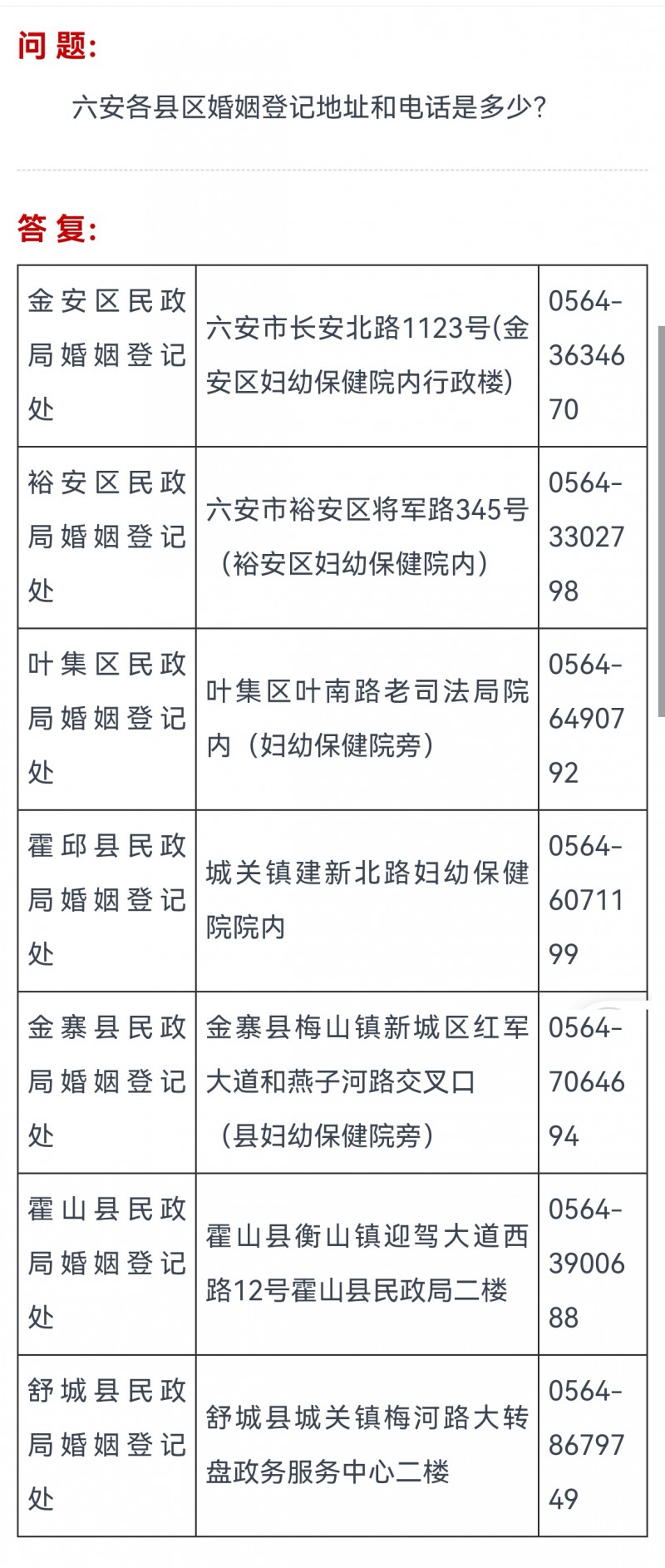 说明:关于六安市各区县婚姻登记处办公地址和办公电话信息汇总表的信息作出免责说明,信息来源于当地主管部门公开之内容,整理转载此文是出于传递更多便民服务信息之目的。以上信息仅供参考,由于时间及其他方面的原因可能会发生变动,不准确之处请原谅!若有来源标注错误或者其它差错或侵犯了您的合法权益,请与本网站联系,我们将及时更正、删除。以上便民信息内容如有变更,以相关部门的更新内容为主。谢谢。