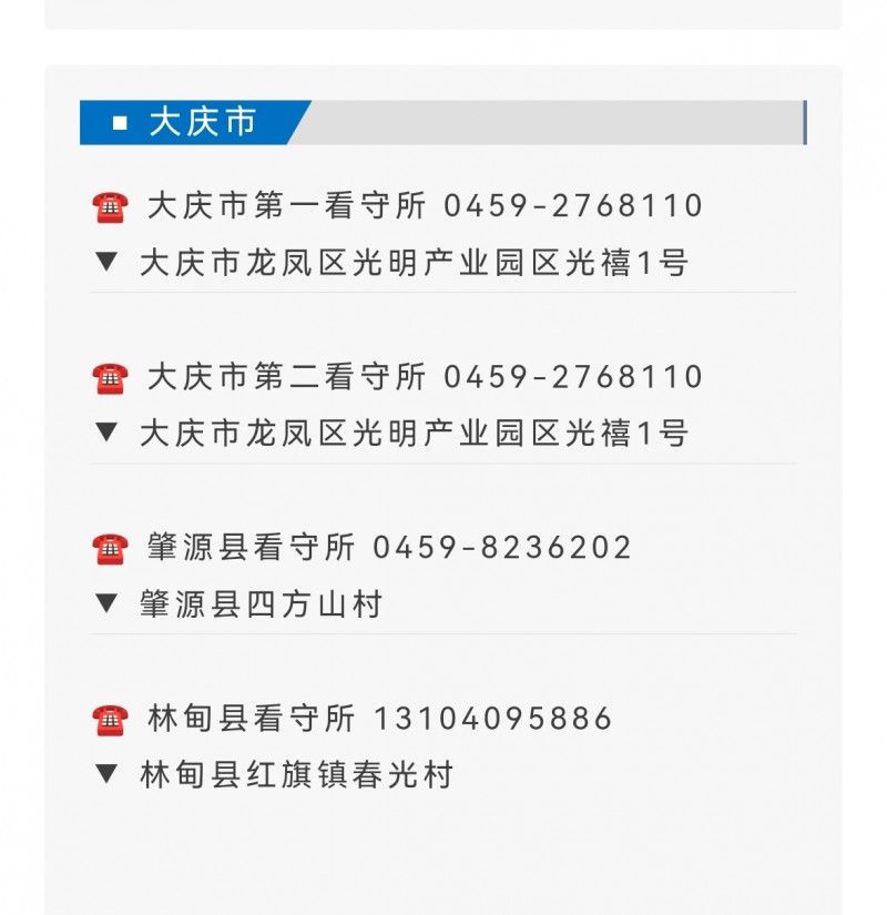 说明:关于大庆市辖区各看守所单位地址及办公电话汇总表的信息作出免责说明,本信息仅为提供便民服务目的而发布,相关信息来源于公开信息或第三方。本信息仅作参考,信息的准确性和完整性在此不作任何保证,也不保证所包含的信息和建议不会发生任何变更,我们仅对公开资料中的内容做原文提取或者整理转载。虽然已力求信息的客观完整,但随着时间与其它情况发生,难免信息出现差错或者变更。如果出现差错或者侵犯了您的权利,请通知本网站客服,我们将及时更正或者删除。谢谢。